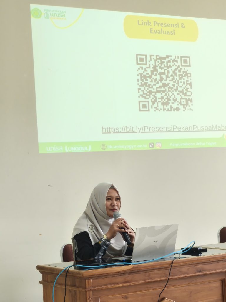 Library Orientation Sesi 4 UNISA Yogyakarta Berlangsung Interaktif dan Inspiratif. Kegiatan ini berlangsung Kamis, 9 Oktober 2025. Pekan Pustakawan Menyapa (PUSPA) merupakan kegiatan Library Orientation bagi semua mahasiswa baru di UNISA Yogyakarta. Kegiatan ini digelar secara hybrid, secara luring di Ruang Sidang sebelah timur lantai 2 Gedung Siti Moendjijah dan daring melalui Zoom Meeting. Pelaksanaan Library Orientation hari ke empat ini kegiatan berlangsung meriah dengan dihadiri mahasiswa baru lintas prodi. Acara diawali dengan sambutan pembukaan oleh bapak Ibu Dita Rachmawati, SIP, selaku moderator yang menekankan pentingnya mengenal perpustakaan sejak awal masa kuliah.